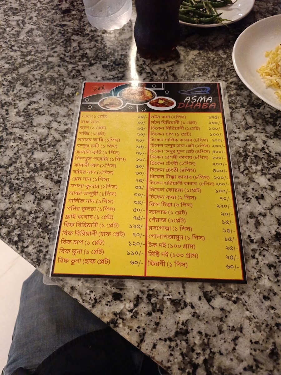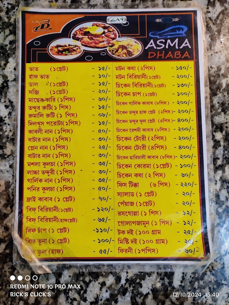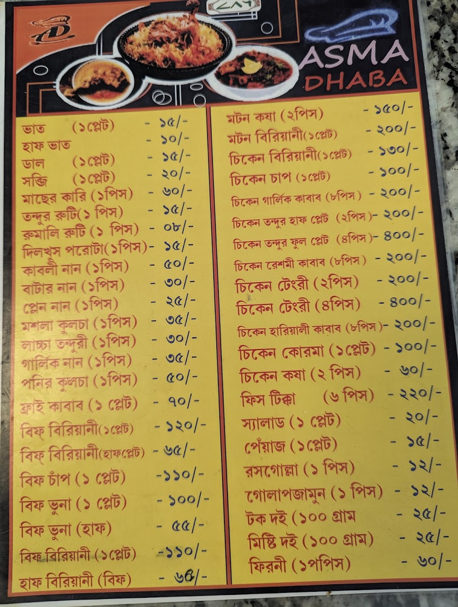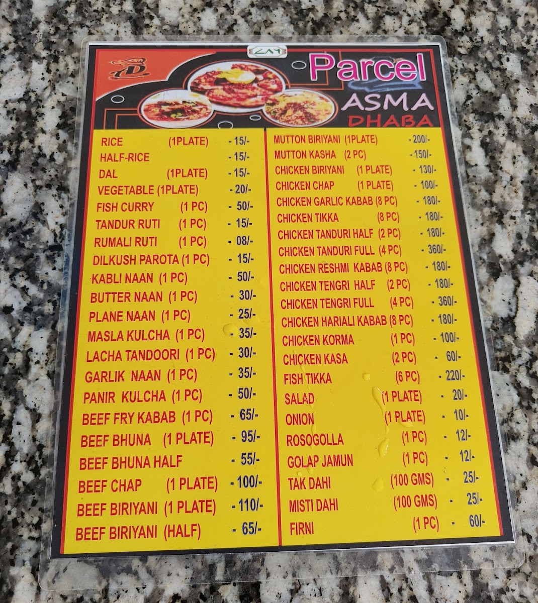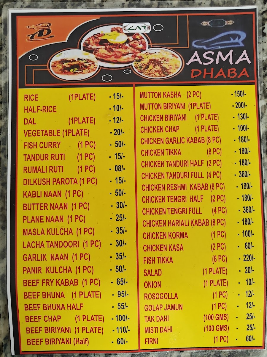 Asma Dhaba offers a straightforward menu that reflects the heart of traditional Indian biryani and dhaba-style comfort food. The selection focuses on hearty meals and familiar flavors, making it ideal for casual lunches, relaxed dinners, or whenever you’re in the mood for something satisfying without fuss.